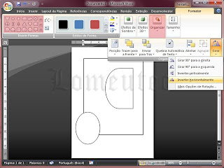 Depois de traçada essa forma vamos invertê-la e ajustá-la ao layout do cartaz. Para inverter essa forma, deixe-a selecionada e clique no menu 'Desenhar' que está na barra de ferramentas de desenho, clique em 'Girar ou inverter' e selecione 'Inverter horizontalmente'.